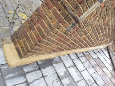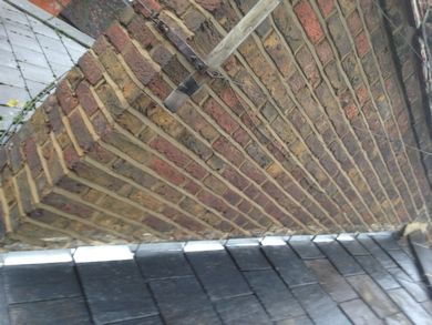 London Roofing chopped out the old pointing and renewed with a weather struck point joint. We removed slates and soakers against the stack and fitted new alley soakers and new Spanish slates.